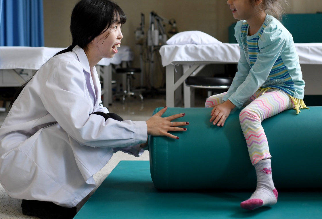 サヘゾダちゃんのリハビリを行う理学療法士・閔暁娟さん(左)